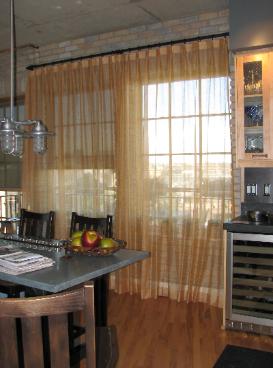 This client warmed up their industrial Downtown loft with sheer Euro pleat draperies on a custom iron rod. |