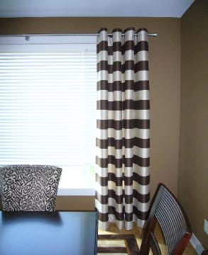 | This striking look includes grommeted panels in a bold horizontal stripe on a decorative brushed nickel metal pole and was designed by Eminent Interior Designs. |