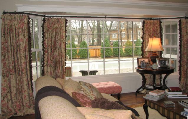 | This sumptuous Living Room treatment, designed by Diane Lumpkin of RCC Interiors, features full, puddled panels with tassel trim on both edges installed on a custom shaped bay rod. |