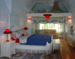 | The curved wall in the Girl's Bedroom of the 2004 ASID Showcase Home was treated with decadent layers of fabric. Designed by Wiggles 'N Giggles. |